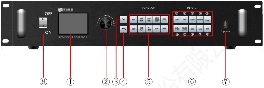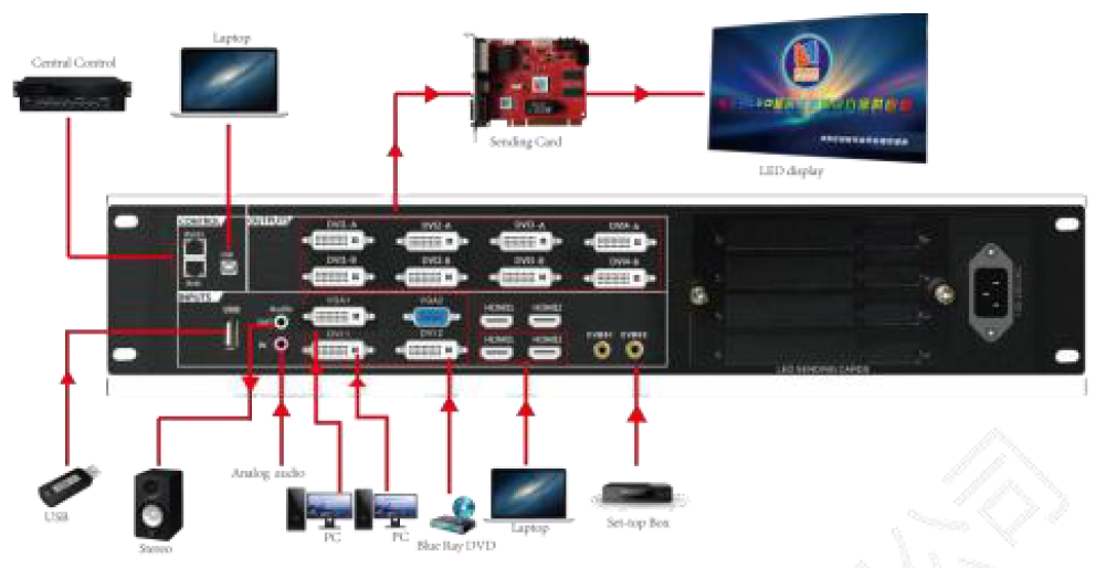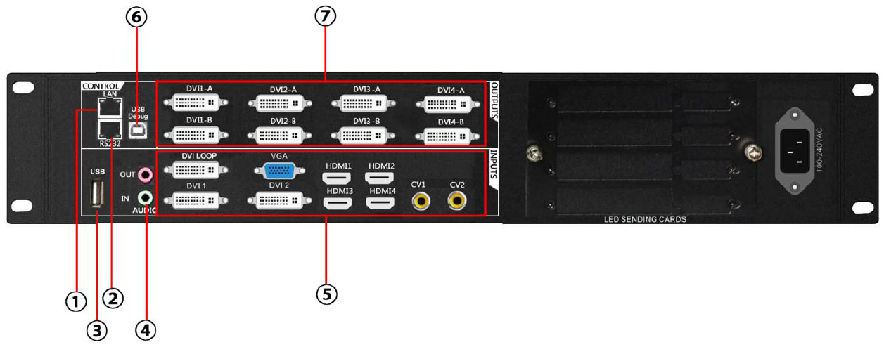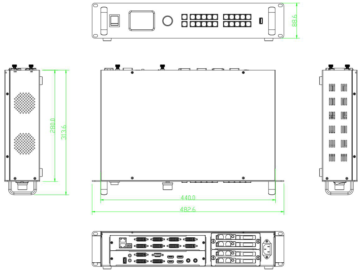 | 6 | Giao diện đầu vào: 9 giao diện đầu vào, 2*DVI, 4*HDMI, 1*VGA, 2*CVBS, 1*USB đầu vào. |